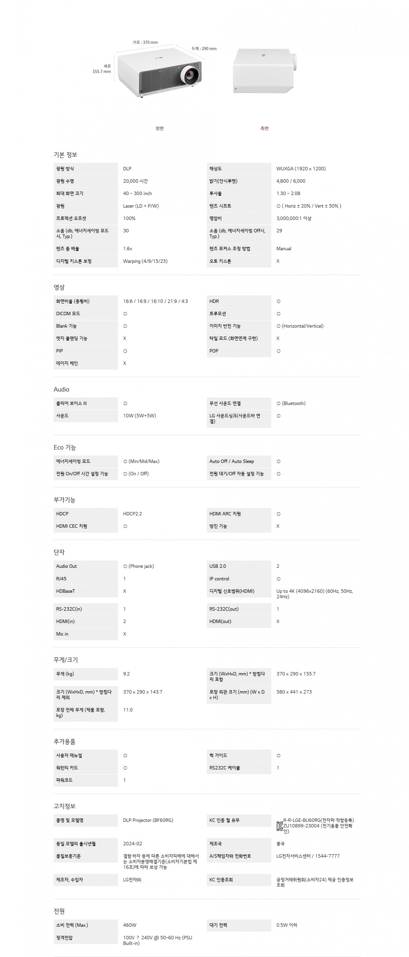 WUXGA 고화질 레이저 & 6,000 안시 루멘1.6배 줌 기능과 렌즈 시프트 지원SuperSign & LG ConnectedCare 원격 관리 솔루션