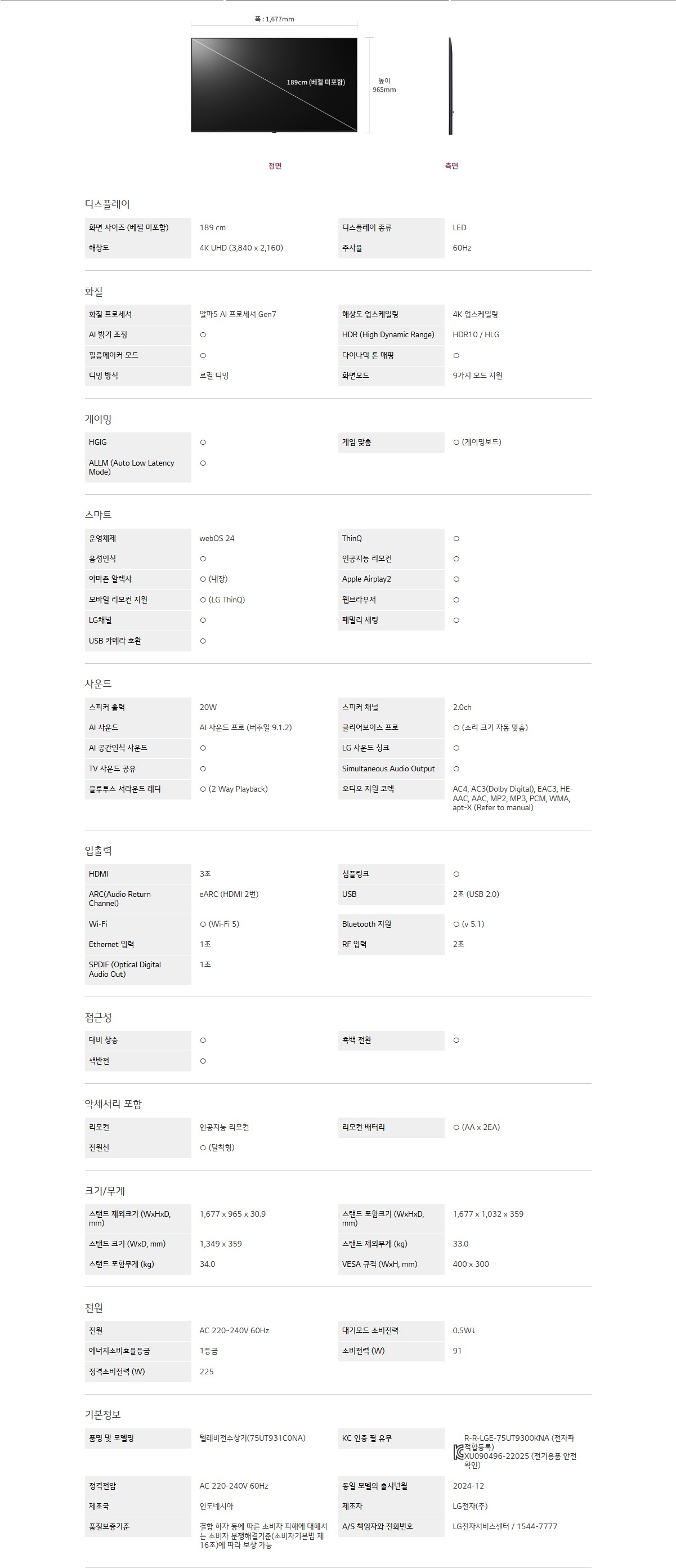 화면 사이즈 (베젤 미포함) : 189 cm
