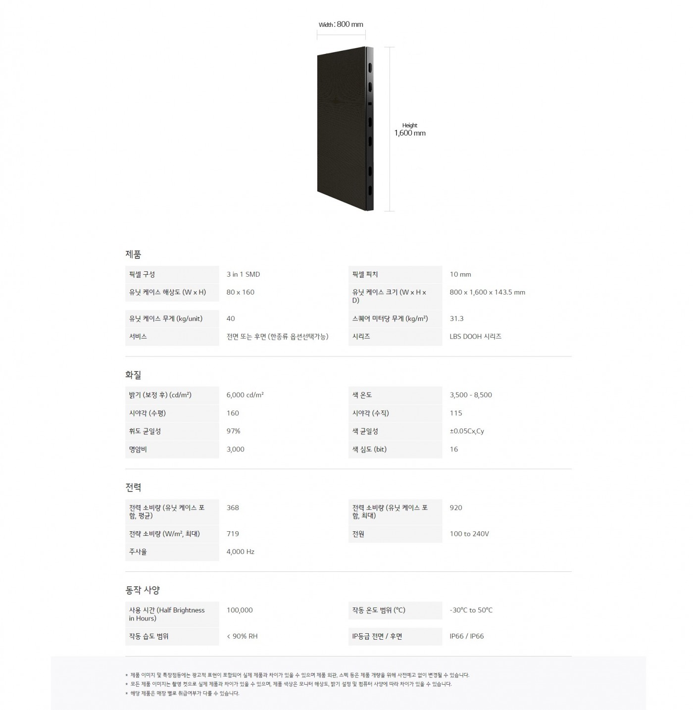 유닛 케이스 크기 (W x H x D) : 800 x 1,600 x 143.5 mm밝기 (보정 후) (cd/m²) : 6,000 cd/m²시리즈 : LBS DOOH 시리즈