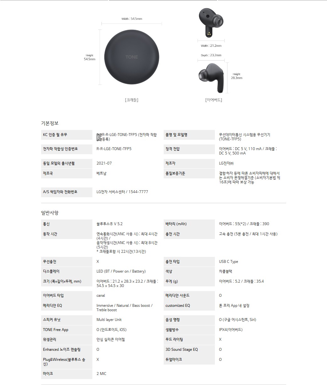 통신 : 블루투스® V 5.2배터리 (mAh) : 이어버드 : 55(*2) / 크래들 : 390충전 시간 : 고속 충전 (5분 충전 / 최대 1시간 사용)